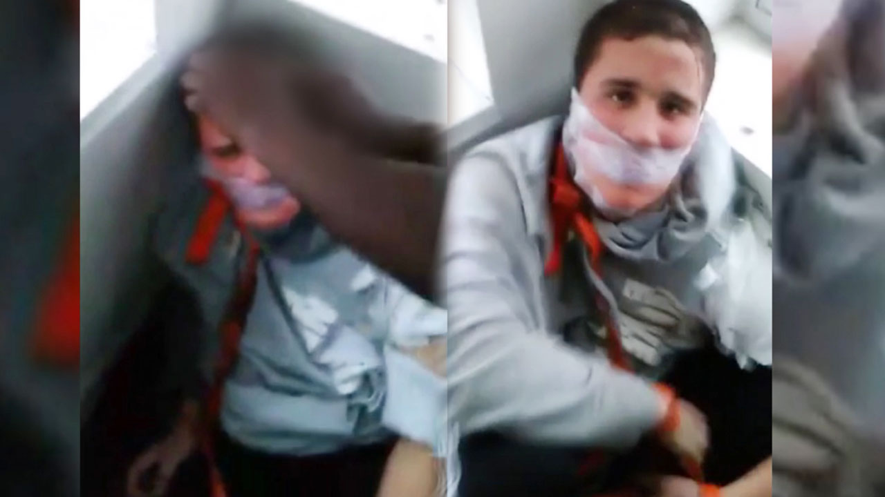 팔과 입이 테이프에 묶인 백인 남성이 10대 흑인들로부터 속수무책 무차별 폭행을 당합니다.