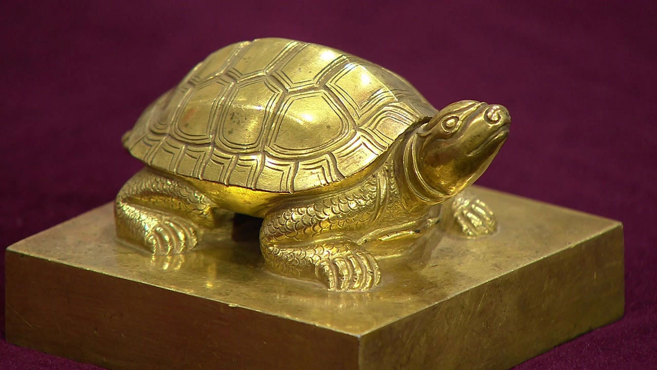 하얀 종이를 펼치자 황금으로 빚어진 대형 사각 도장이 모습을 드러냅니다.