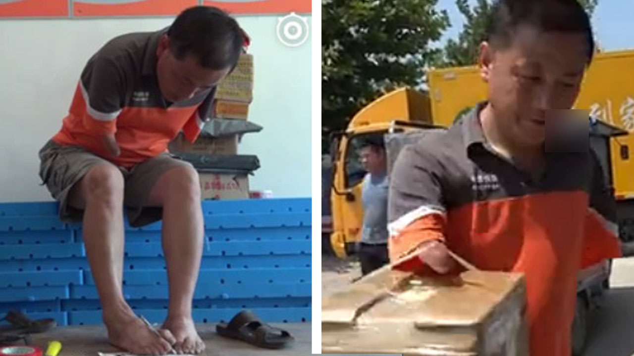 중국인 자오 하이펑 씨는 불과 3살 때 전기 사고로 양팔을 잃었다. 그는 장애 때문에 직업을 얻기 매우 힘들었지만, 3년 전 피나는 노력으로 배달 일을 시작했다.