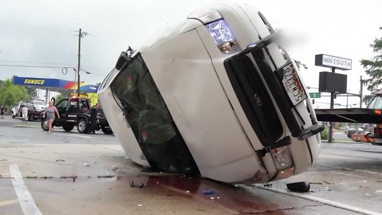 그런데 바람이 몰아치자 차는 종이 조각처럼 공중으로 붕 떠올라 다른 차량 위에 처박힙니다.