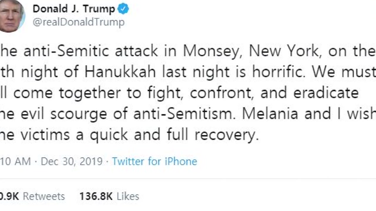 트럼프 대통령은 "간밤에 뉴욕 몬시에서 벌어진 반유대주의 공격은 끔찍하다"며, "멜라니아와 나는 피해자들이 조기에 완전하게 회복하기를 기원한다"고 썼습니다.