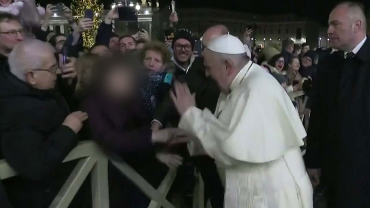 교황은 여성이 계속 손을 놓지 않자 여성의 손등을 두 번 내리친 후 불쾌한 표정으로 다른 곳으로 발길을 돌렸습니다.