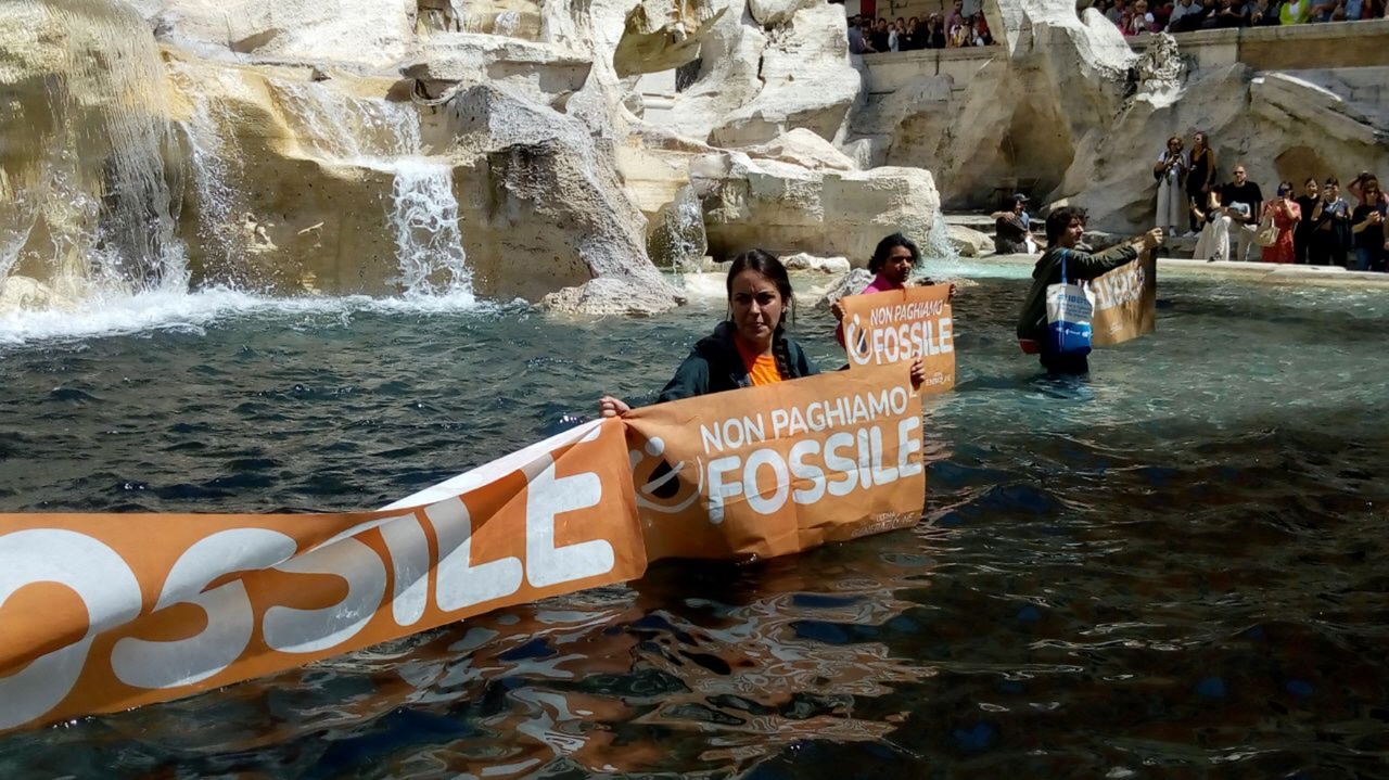 로이터, AFP 등 외신 보도에 따르면 이탈리아의 환경단체 울티마 제네라치오네 활동가 7명은 “우리는 화석(연료)에 돈을 내지 않겠다”는 문구가 적힌 팻말을 들고 트레비 분수에 들어가 식물성 먹물을 부었다.