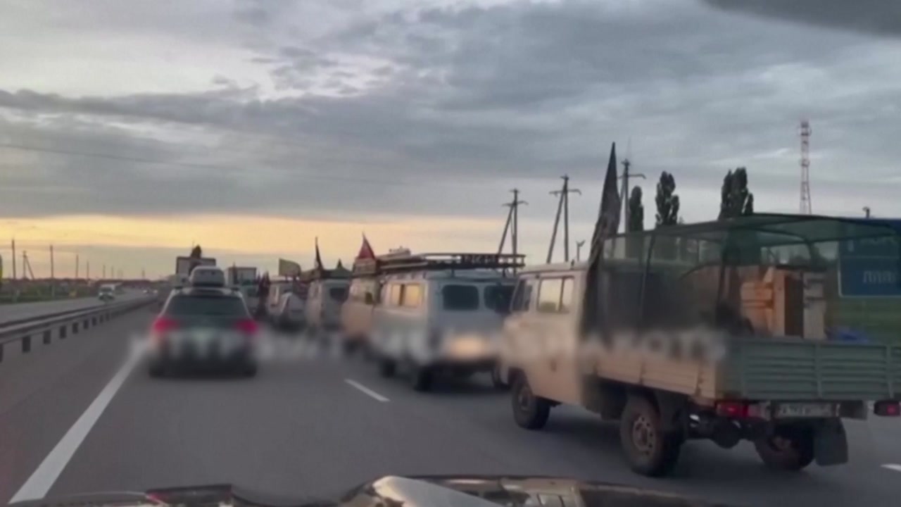 현지시간 15일 공개된 화면 속 일부 차량에는 용병기업 바그너그룹의 깃발이 달려 있습니다.