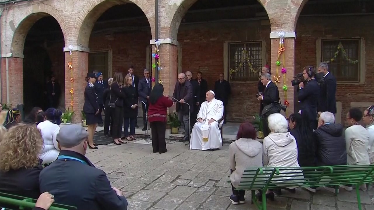 교황은 헬리콥터를 타고 베네치아 주데카 섬에 있는 여자 교도소에 도착해 80여 명의 재소자, 직원, 자원봉사자와 일일이 인사를 나눴습니다.