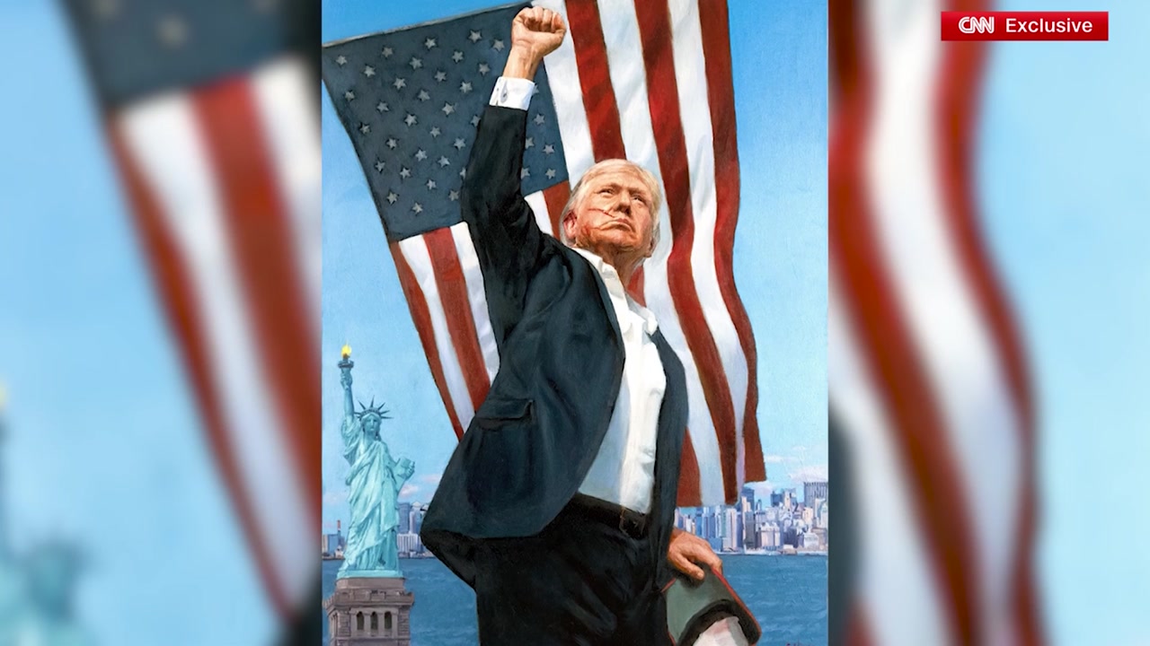 공개된 초상화는 러시아의 유명 화가 니카스 사프로노프가 그린 것으로, 지난해 7월 트럼프 대통령이 선거 유세 도중 암살 시도에서 살아남은 뒤 피를 흘리며 주먹을 치켜든 모습을 표현했습니다.