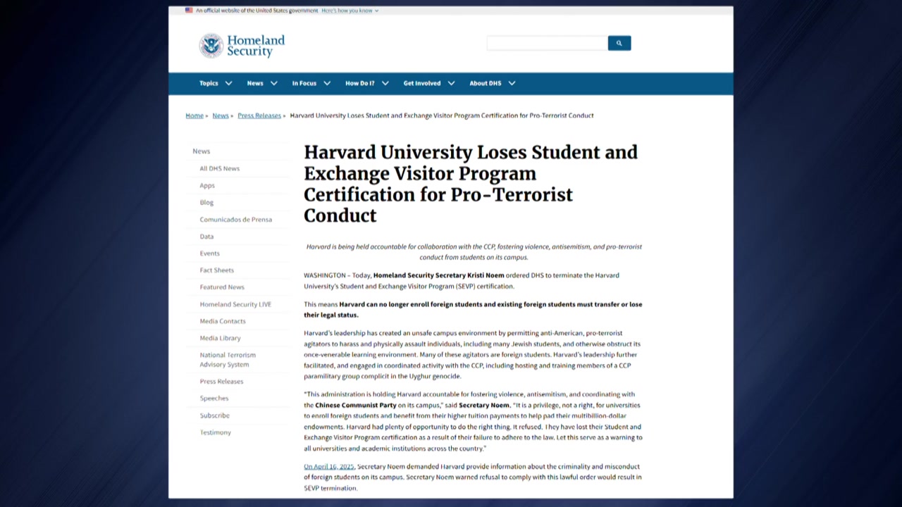 크리스티 놈 국토안보부 장관은 성명을 통해 하버드대가 캠퍼스 내에서 폭력과 반유대주의를 조장하고 중국 공산당과 협력하는 데 대해 책임을 묻는 차원에서 학생 및 교환 방문자 프로그램 인증을 취소했다고 밝혔습니다.