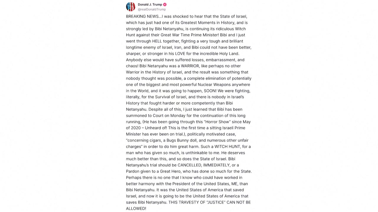 트럼프 대통령은 SNS 트루스 소셜에 올린 글에서, "네타냐후의 재판이 즉시 취소되거나, 나라를 위해 많은 일을 한 위대한 영웅을 사면해야 한다"며 이스라엘이 네타냐후를 상대로 "우스꽝스러운 마녀 사냥"을 계속하고 있다고 적었습니다.