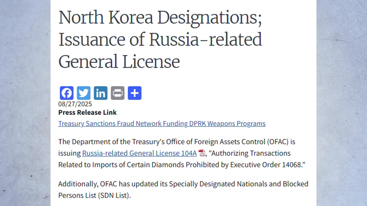 또 지난달 8일과 24일 취해진 북한 IT 근로자 제재에 이은 후속 조치라고 덧붙였습니다.