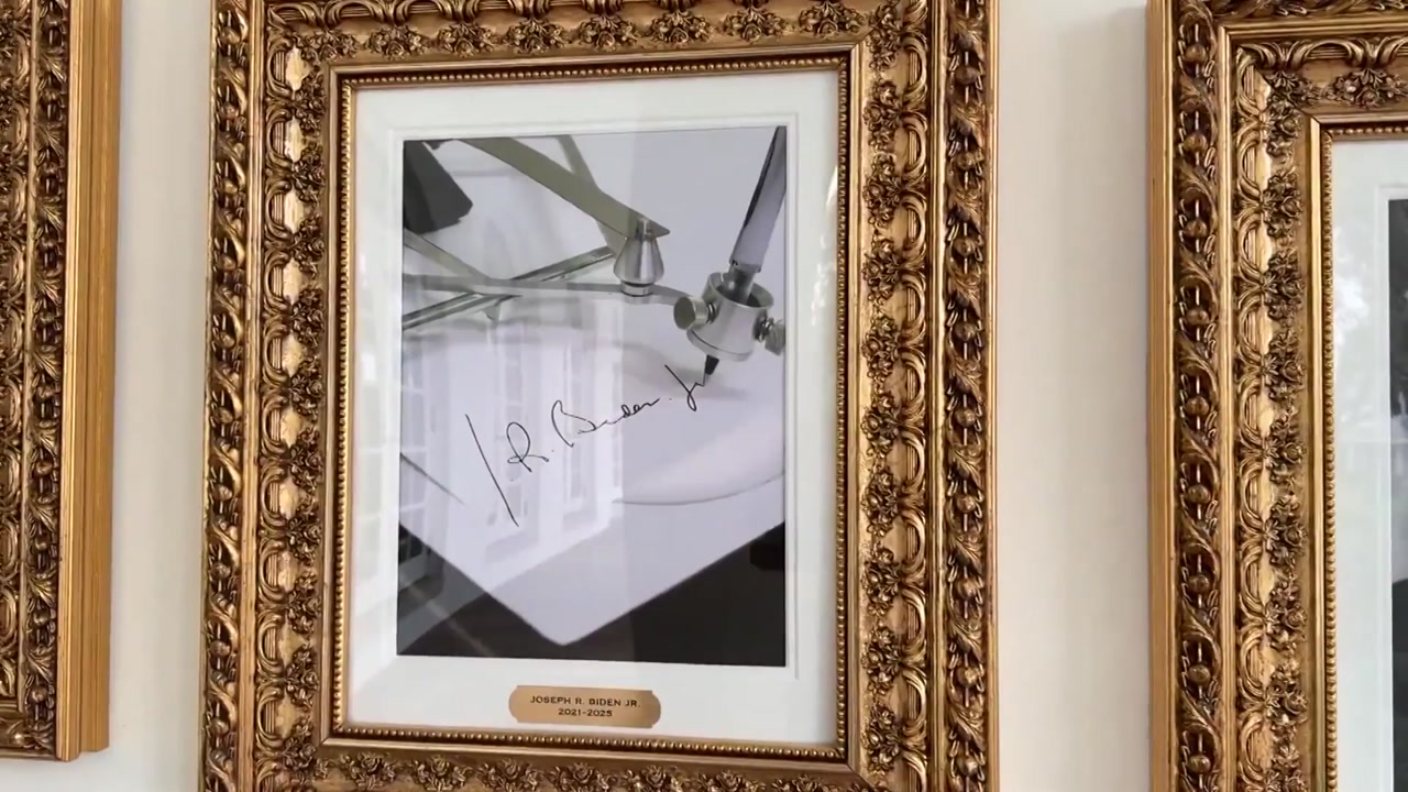 미국 백악관이 역대 대통령의 흑백 사진을 전시한 기념 공간을 만들면서 조 바이든 전 대통령 자리에 얼굴 대신 자동서명기, '오토펜' 사진을 걸었습니다.