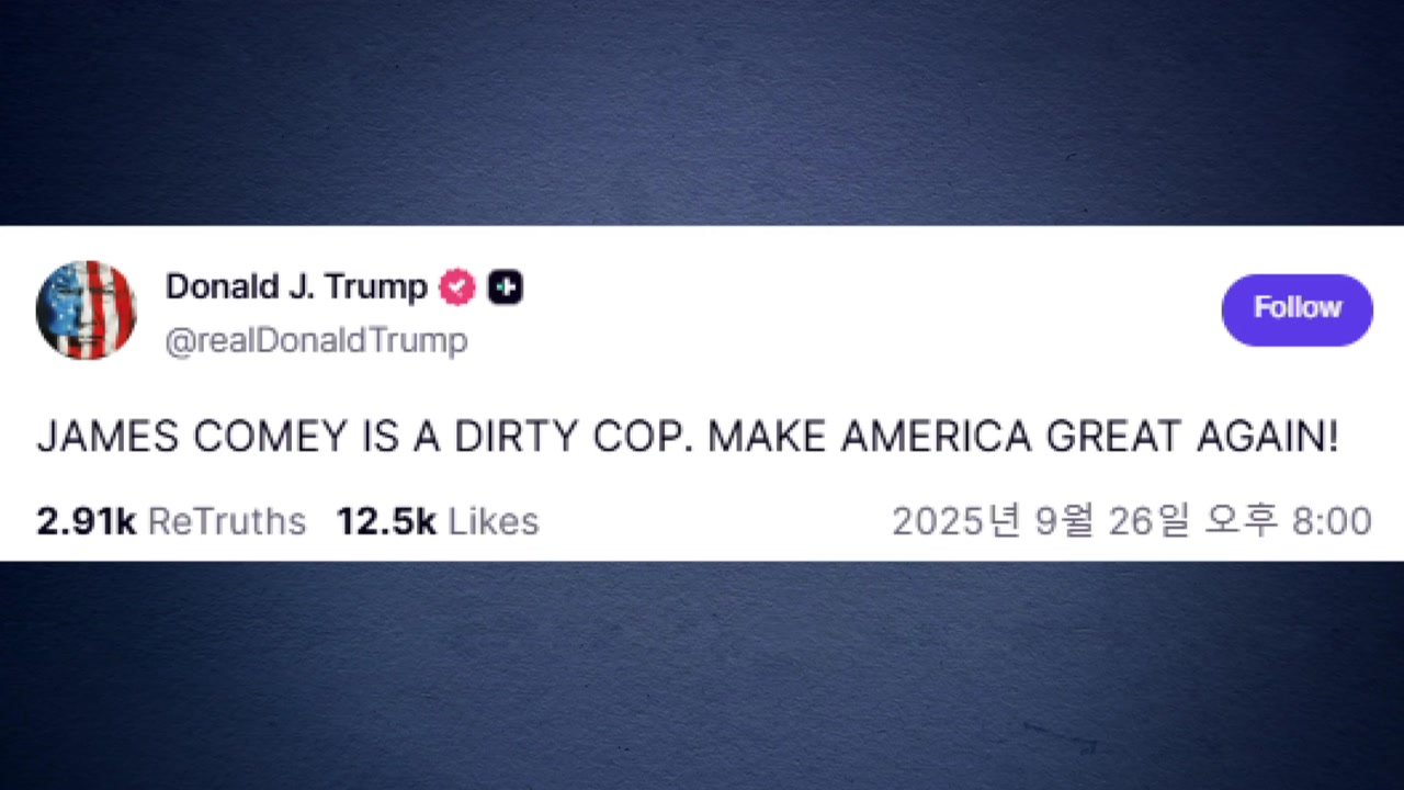 트럼프 대통령은 현지 시간 26일 SNS 트루스소셜에 올린 글에서 "부패한 제임스 코미를 좋아하든 안 하든, 그는 거짓말을 했다"고 말했습니다.