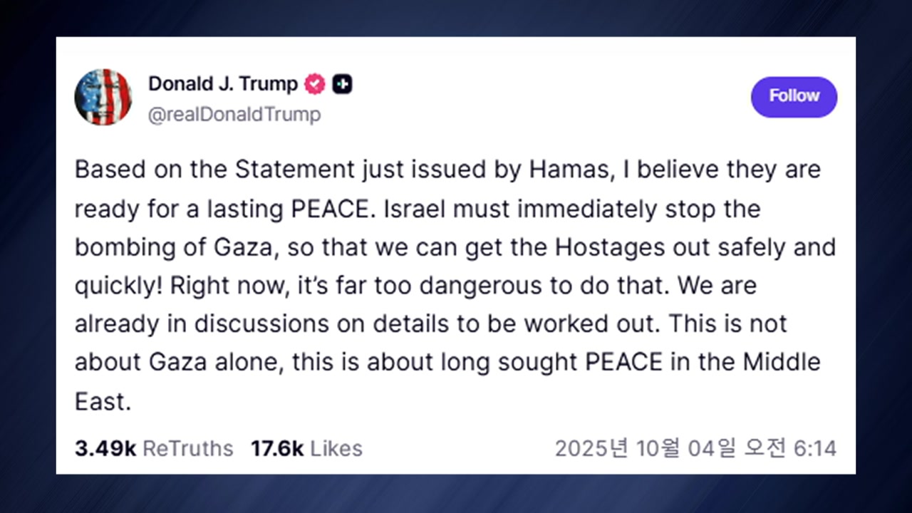 트럼프 대통령은 자신의 SNS인 트루스소셜에 "하마스가 방금 발표한 성명에 따라, 그들이 지속적인 평화에 대한 준비가 돼 있다고 믿는다"며 이같이 적었습니다.