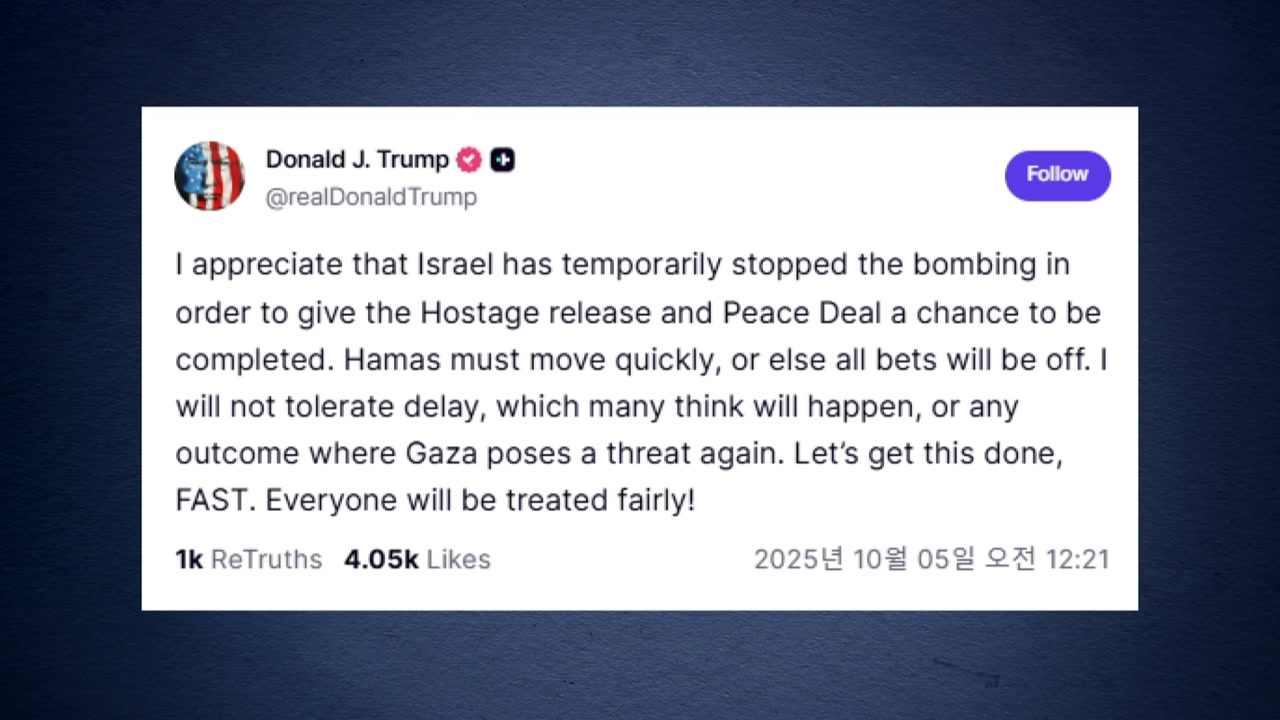 트럼프 대통령은 현지 시간 4일 자신의 SNS 트루스 소셜에서 "하마스는 신속히 움직여야 하며, 그렇지 않으면 모든 약속은 무효가 될 것"이라고 썼습니다.