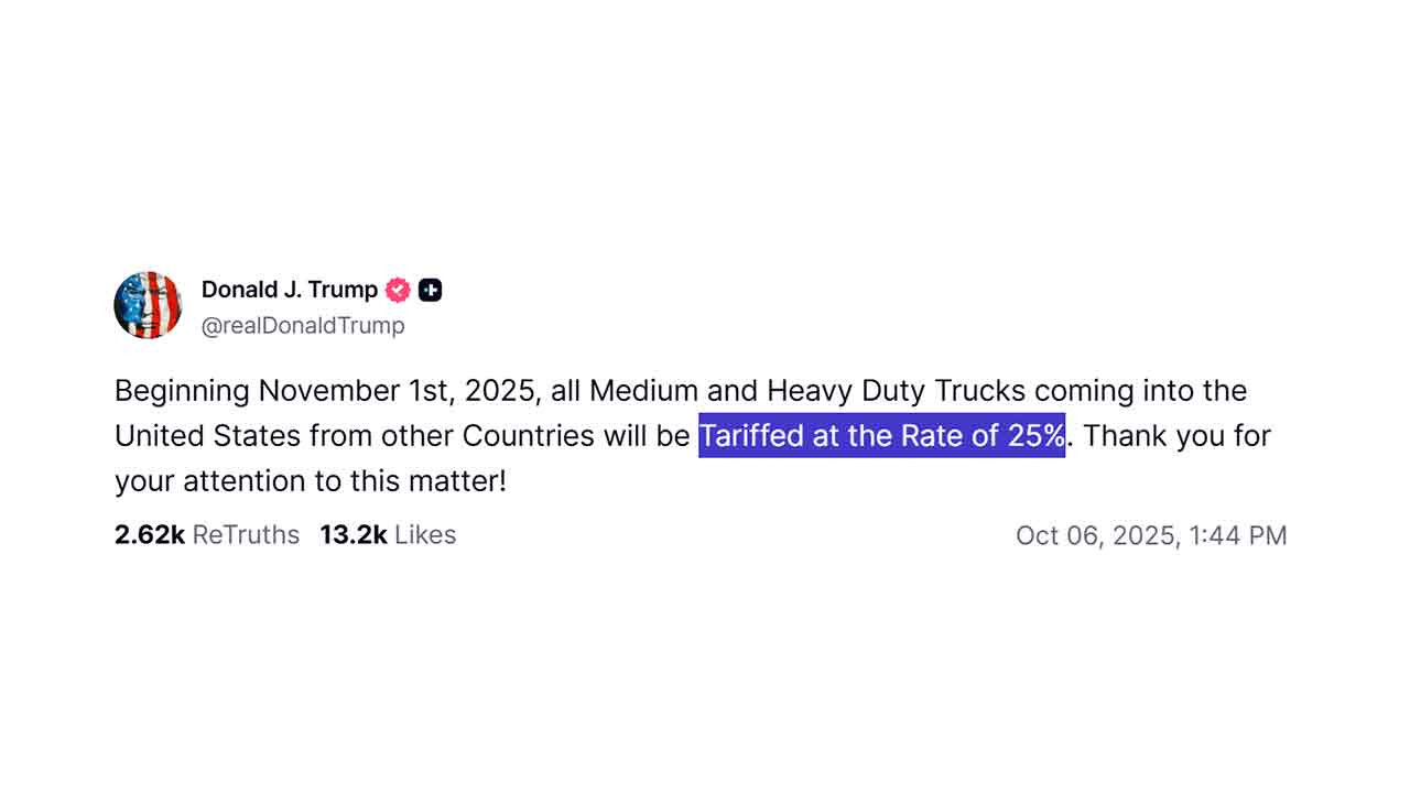 트럼프 대통령은 소셜미디어 트루스 소셜에 "다른 나라에서 미국으로 들어오는 모든 중형 및 대형 트럭은 11월 1일 자로 25%의 관세가 부과될 것"이라고 적었습니다.