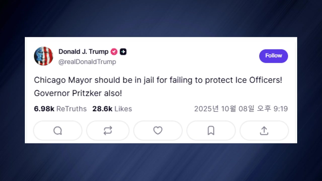 도널드 트럼프 미국 대통령이 시카고 시장과 일리노이주 주지사가 이민단속국 직원들을 보호하지 못했다며 감옥에 가야 한다고 주장했습니다.