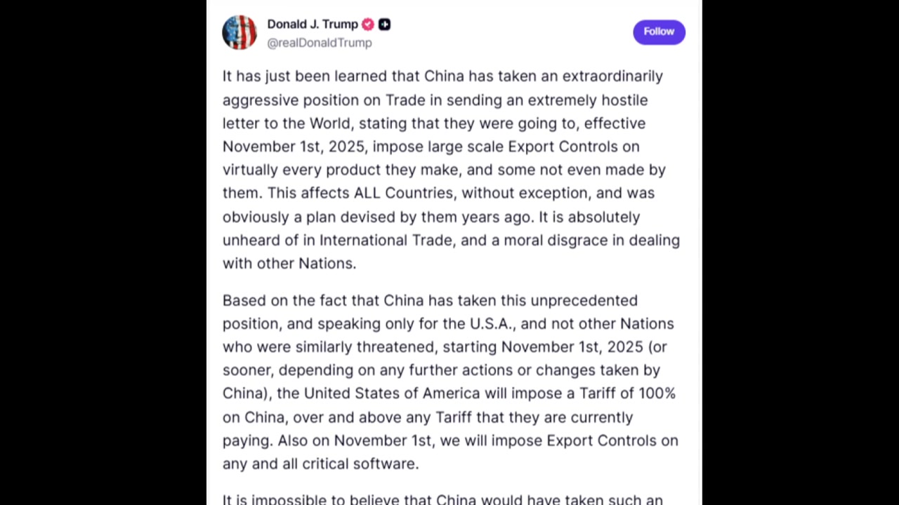트럼프 대통령은 중국이 11월 1일부터 사실상 자국이 생산하는 거의 모든 제품 등에 대해 대규모 수출 통제를 시행하겠다는 매우 적대적인 내용의 서한을 전 세계에 발송했다는 사실이 방금 확인됐다고 설명했습니다.