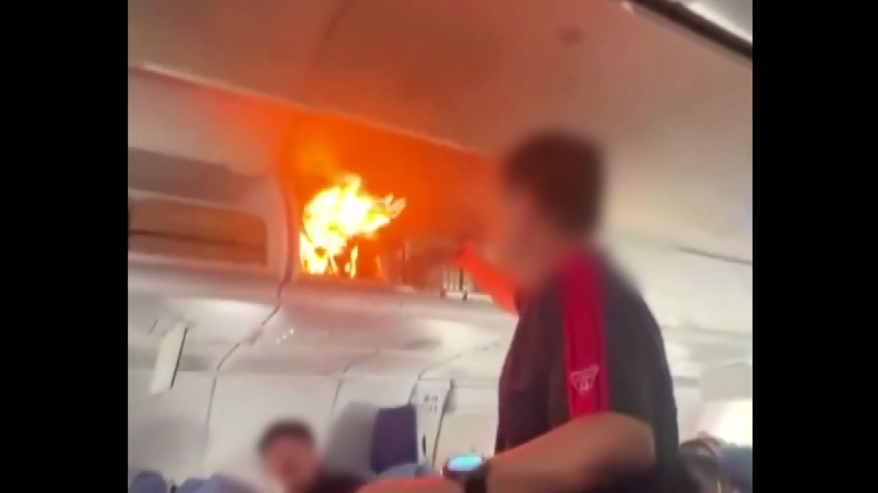 수하물 선반에 불이 나자, 승객들이 비명을 지르고 승무원들이 황급히 움직입니다.