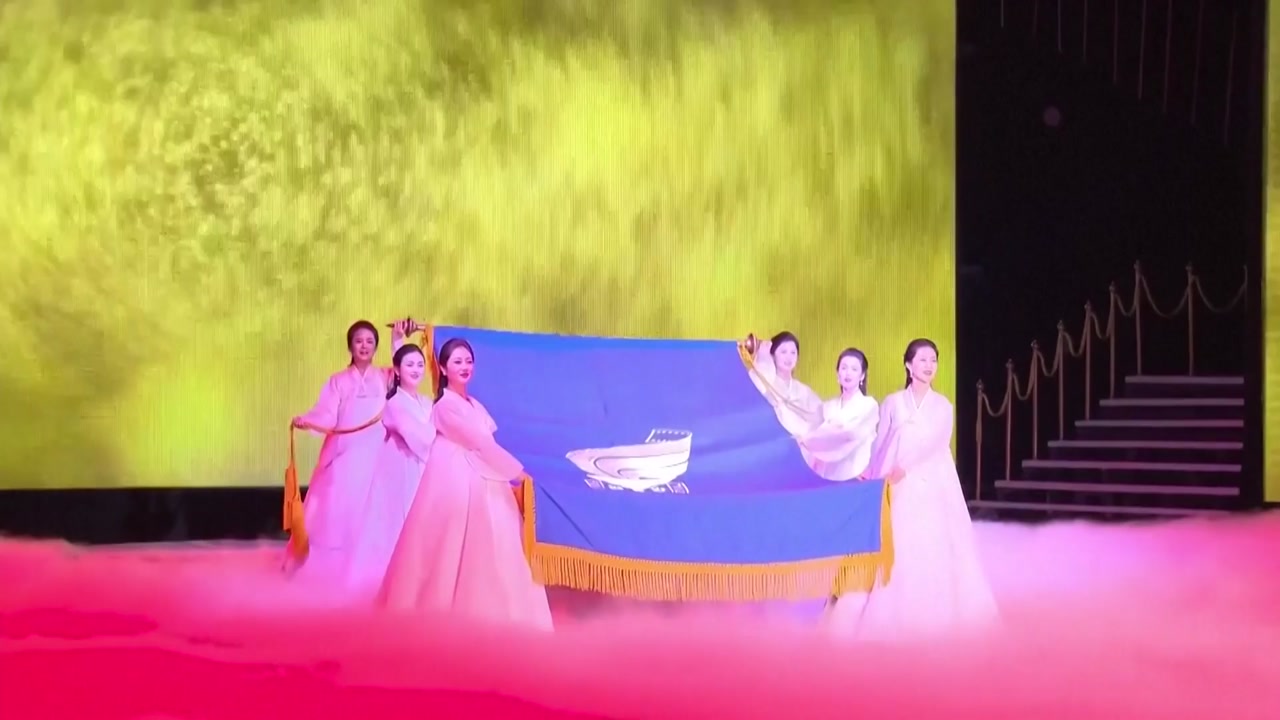 평양국제영화축전을 상징하는 깃발이 무대 위에 등장합니다.