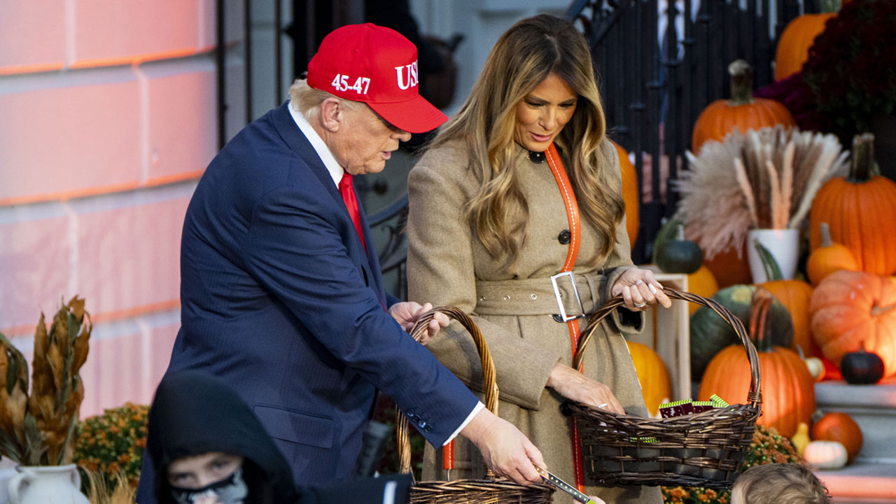 트럼프 부부가 큰 바구니를 들고 백악관 마당에서 아이들에게 초콜릿을 나눠줍니다.