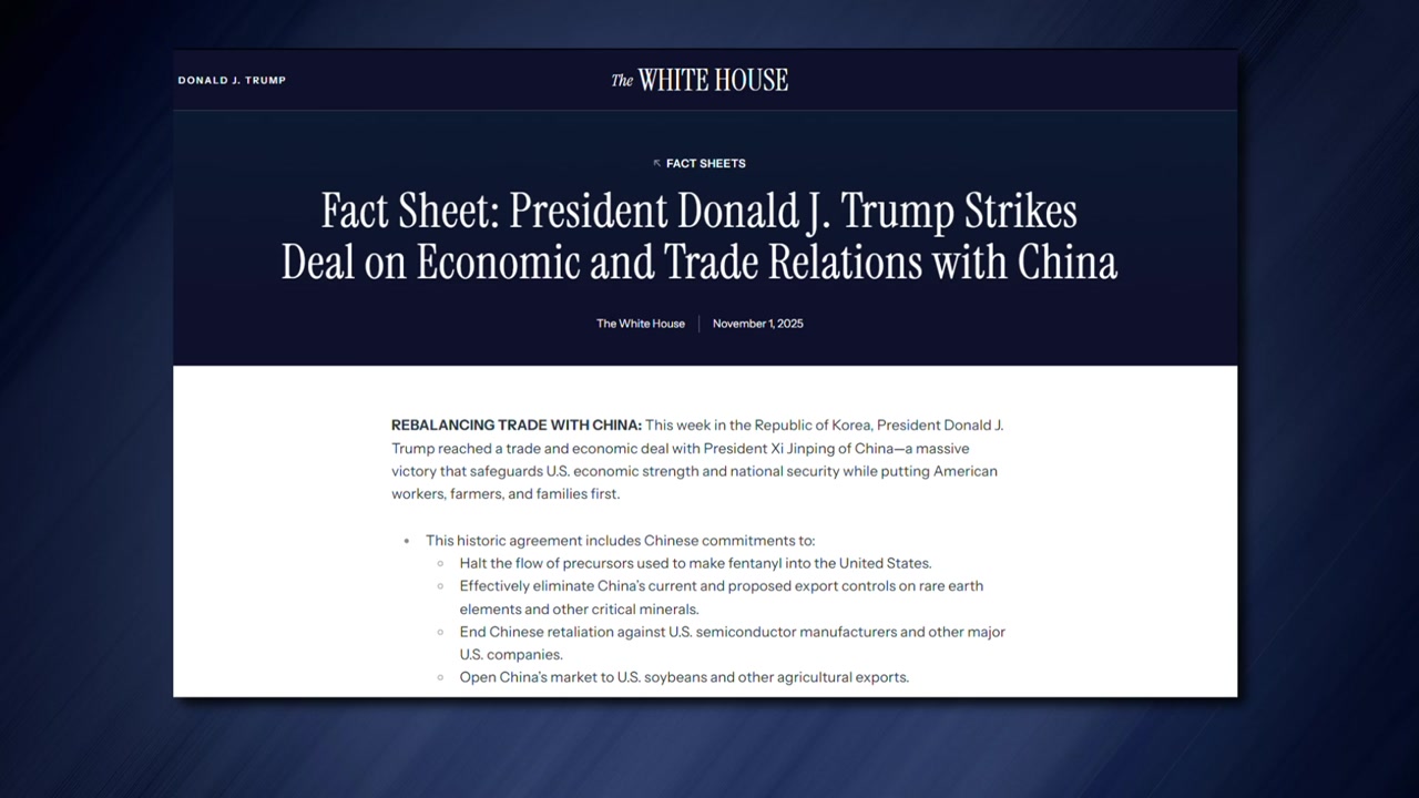 백악관에 따르면 중국은 지난 10월 9일 발표한 희토류 수출통제와 관련 조치의 시행을 전 세계적으로 중단하기로 했습니다.