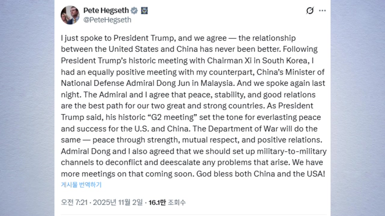 헤그세스 국방부 장관은 현지시간 1일 엑스에서 둥쥔 중국 국방부장과의 최근 대화를 소개하면서 "둥 부장과 난 미중이 충돌을 방지하고 문제가 일어날 경우 긴장을 완화하기 위해 군 대 군 채널을 구축해야 한다는 데 동의했다"고 밝혔습니다.