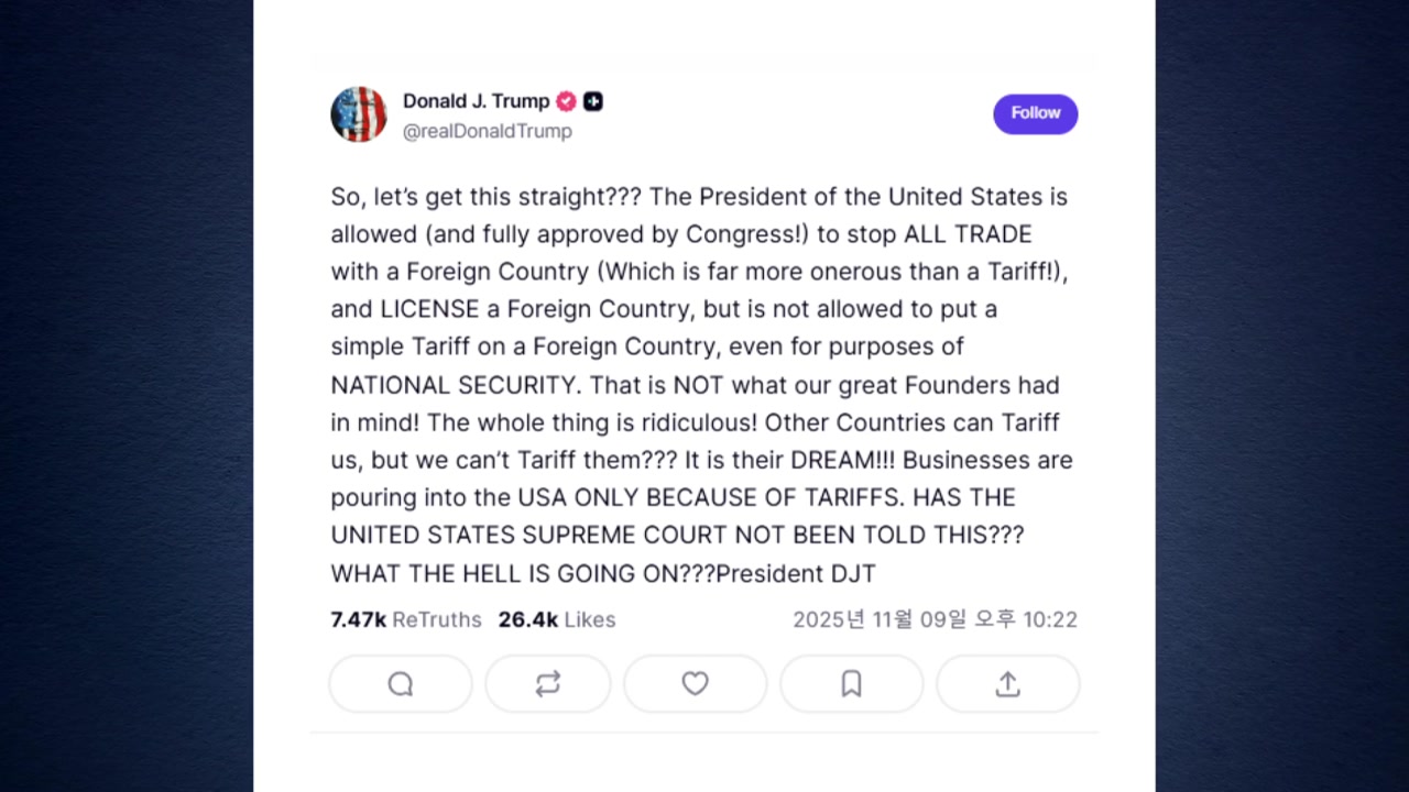 트럼프 대통령은 현지 시간 9일, 자신의 소셜미디어에 "기업들이 미국으로 몰려드는 것은 오로지 관세 때문"이라며 "미 대법원은 이런 얘기를 듣지 못했나? 대체 무슨 일이 벌어지는 건가"라고 적었습니다.