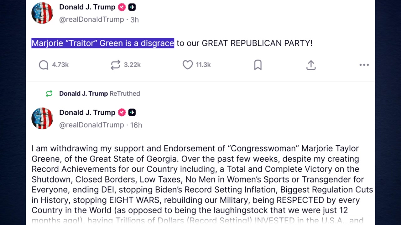 트럼프 대통령은 트루스 소셜을 통해 그린 의원을 겨냥해 "좌파로 돌아서며 공화당 전체를 배신했다"며 "반역자인 마조리 그린은 위대한 공화당의 수치"라고 말했습니다.