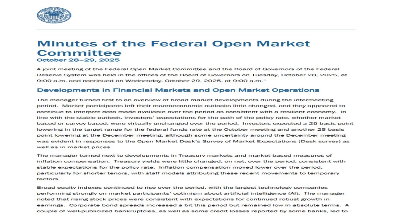 지난달 0.25%포인트 기준 금리 인하 결정이 내려진 연방공개시장위원회, FOMC 회의에서 연방준비제도 인사 대부분은 추가적인 금리 인하가 인플레이션 위험을 높일 수 있다고 본 것으로 나타났습니다.