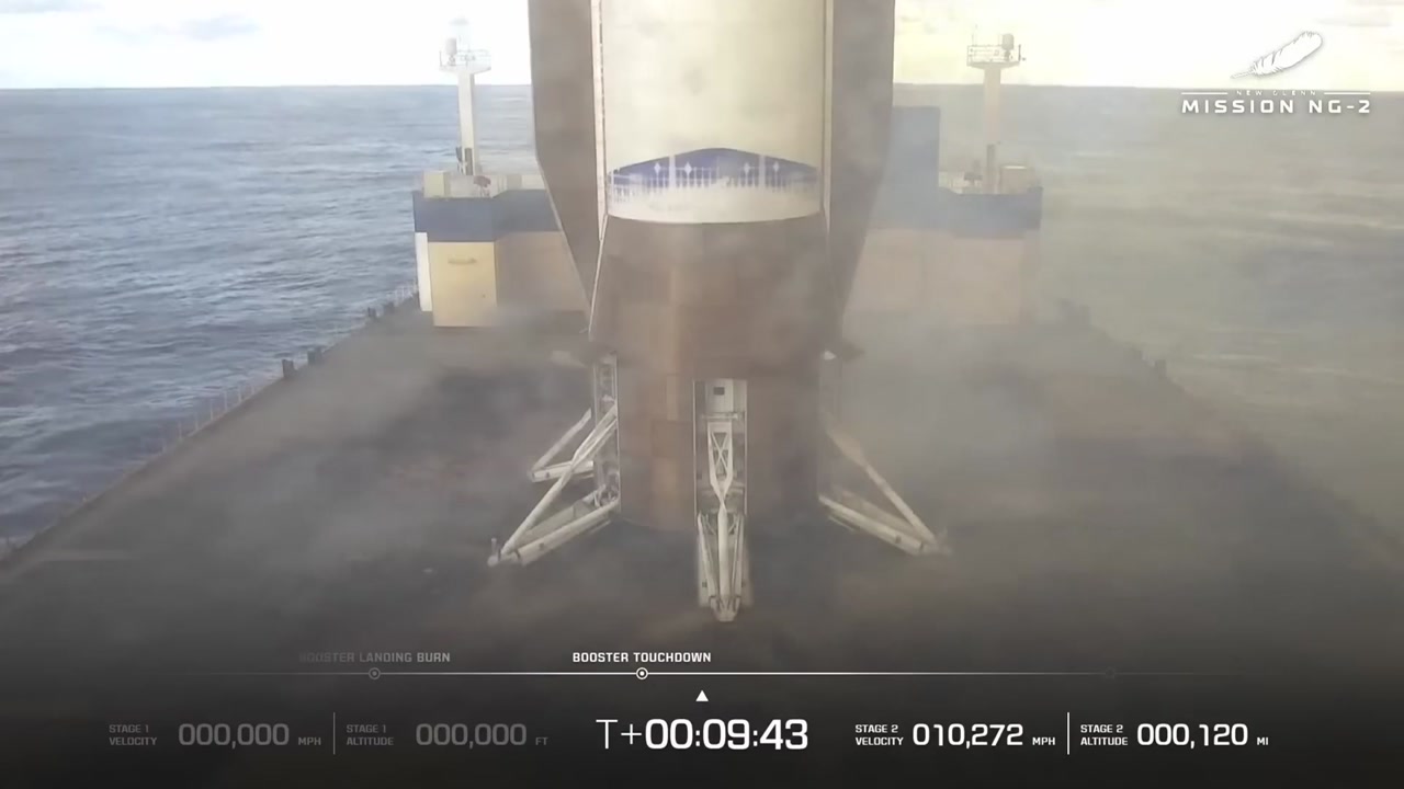 9분 뒤, 뉴 글렌의 재사용 1단 추진체가 역추진 불꽃을 내뿜으며 서서히 내려옵니다.