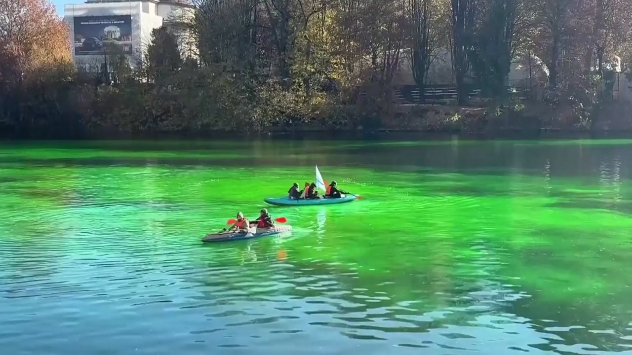 화석연료 퇴출을 요구하는 환경단체가 물길에 녹색 염료를 푼 겁니다.