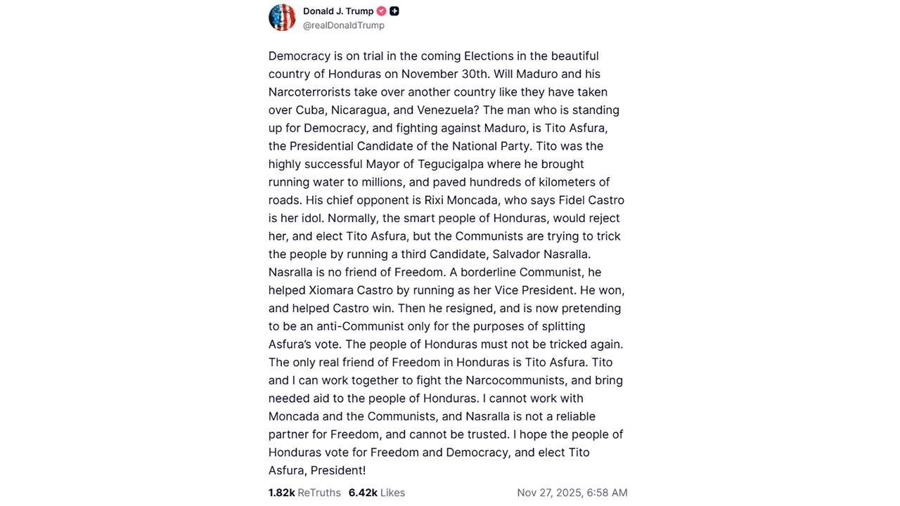 트럼프 대통령은 자신의 SNS에 올린 글에서 "온두라스 국민이 자유와 민주주의를 위해 투표하고, 티토 아스푸라를 대통령으로 선출하기를 바란다"고 썼습니다.