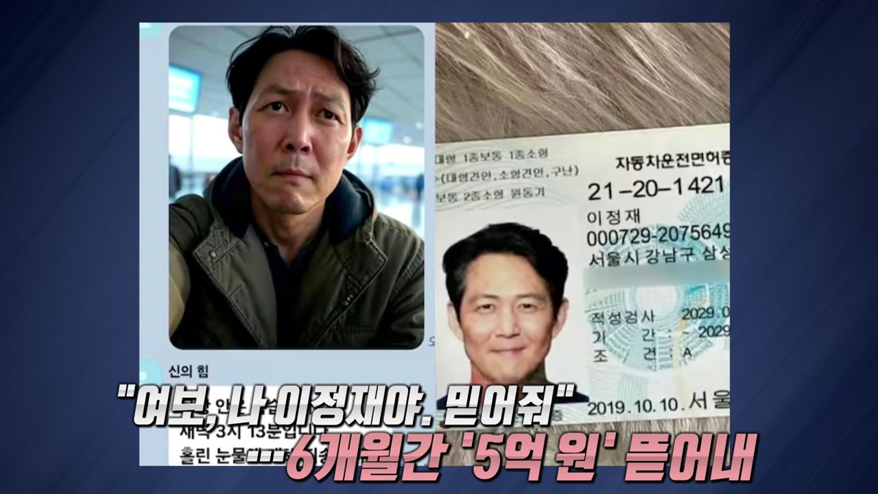 일당은 AI로 이정재 씨 사진을 만들어 SNS로 보내는가 하면 가짜 운전면허증을 보내 신뢰를 쌓은 뒤 팬미팅 VIP 카드 발급비 명목 등으로 6개월 간 5억 원을 뜯어낸 것으로 알려졌습니다.