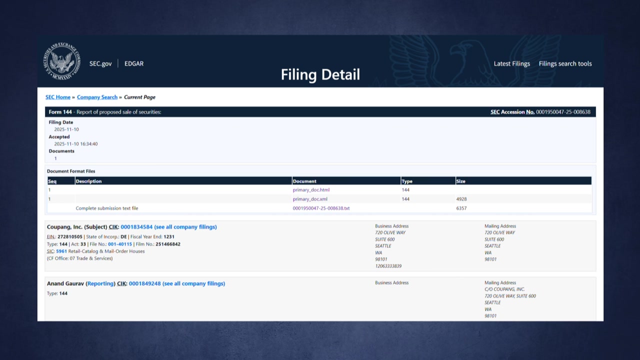 미국 증권거래위원회, SEC는 거랍 아난드 쿠팡 최고재무책임자, CFO가 지난달 10일 쿠팡 주식 7만 5,350주를 주당 29.0195달러에 매도한 사실을 신고했다고 공시했습니다.