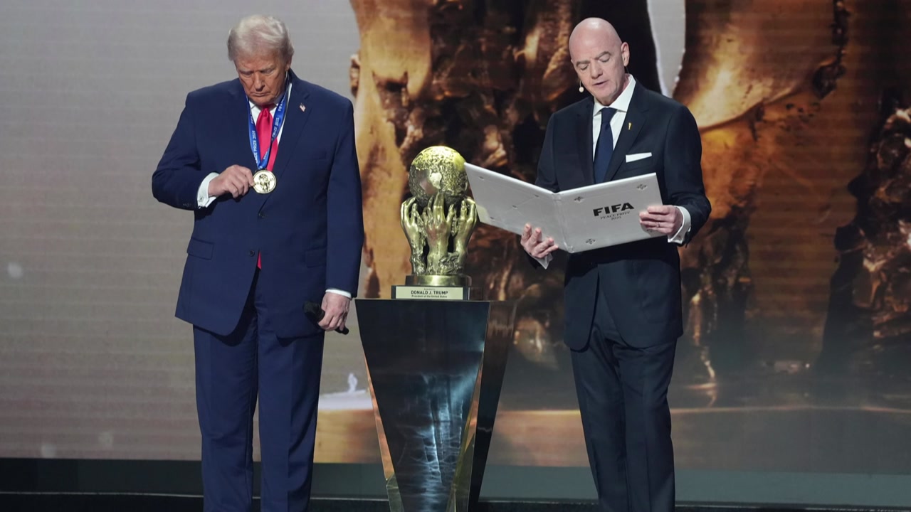 잔니 인판티노 FIFA 회장은 현지 시간 5일 미국 워싱턴DC 케네디 센터에서 열리는 2026 북중미 월드컵 본선 조 추첨식 무대에서 트럼프 대통령에게 평화상을 수여하고 메달과 함께 인증서를 전달했습니다.