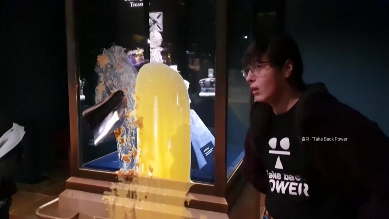 전시실을 둘러보던 관람객들, 가방에서 무언갈 꺼내더니 갑자기 진열장을 향해 던지기 시작합니다.