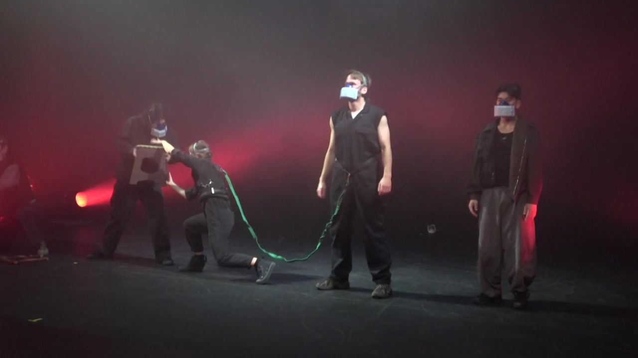 마스크를 쓴 무용수들이 절박하고 처절하게 몸부림칩니다.