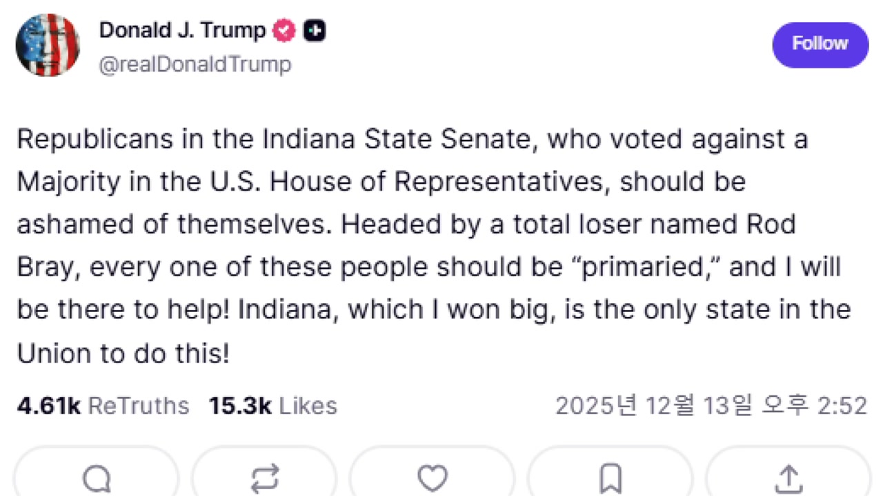 트럼프 대통령은 현지 시간 13일 SNS 트루스소셜에 올린 글에서 "하원에서 과반수로 통과된 사안에 반대표를 던진 인디애나 주 상원 공화당 의원들은 스스로를 부끄럽게 여겨야 한다"고 비판했습니다.
