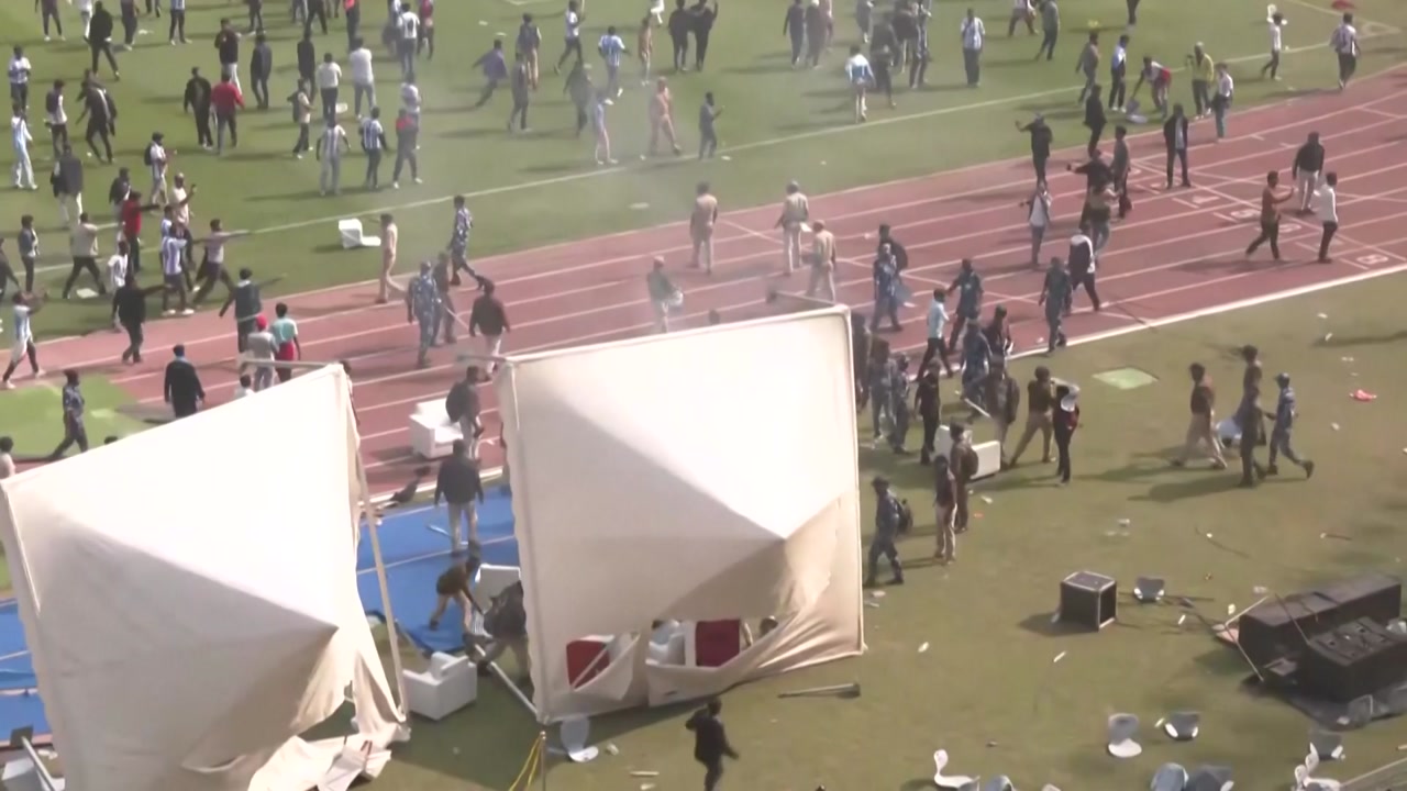 좌석과 기물을 부수고 경기장으로 난입했습니다.