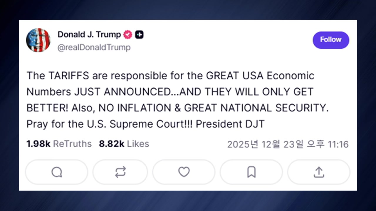 트럼프 대통령은 현지 시간 23일 자신의 SNS에 올린 글에서 "방금 발표된 위대한 미국경제 수치는 관세 덕분"이라며 "앞으로 더 좋아질 것"이라고 썼습니다.