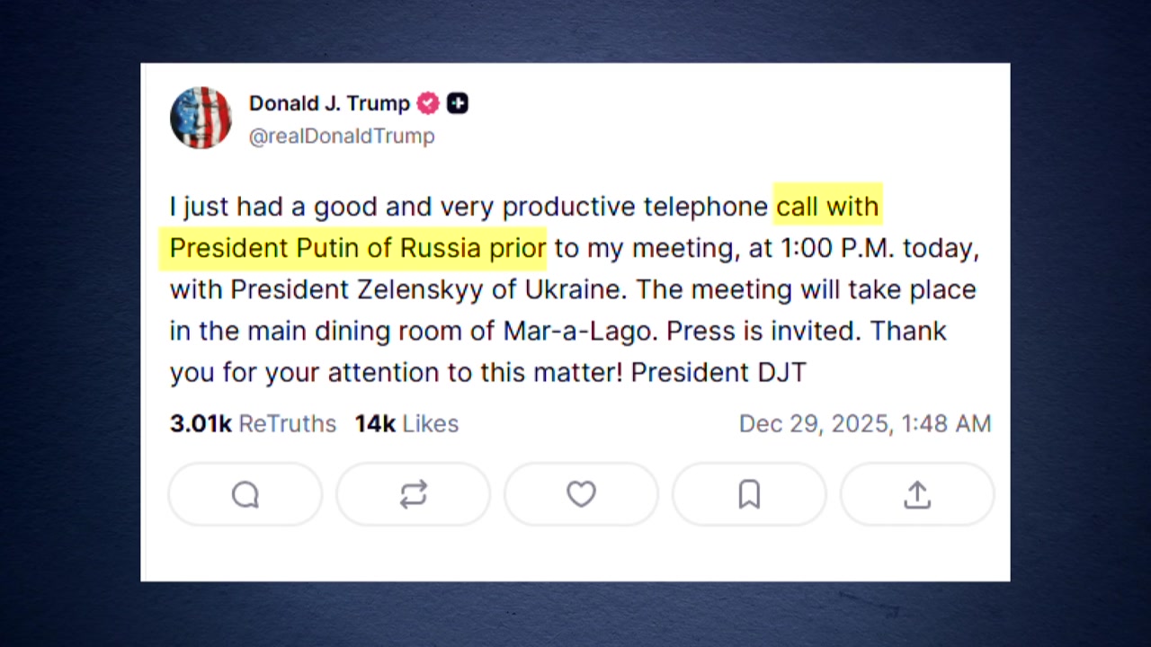 트럼프 대통령은 푸틴 대통령과의 통화에서 우크라이나 전쟁 휴전안의 핵심 사항을 놓고 플로리다에서 진행될 젤렌스키 대통령과의 회담에 대해 논의한 것으로 보입니다.