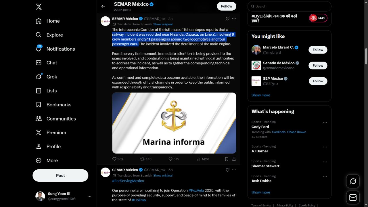 해당 기차는 현지 시간 28일 아침 오악사카주 살리나 크루스를 출발해 베라크루스주 코아트사코알코스로 향하던 중 오악사카 니산다 마을 인근에서 철로를 이탈한 것으로 나타났습니다.