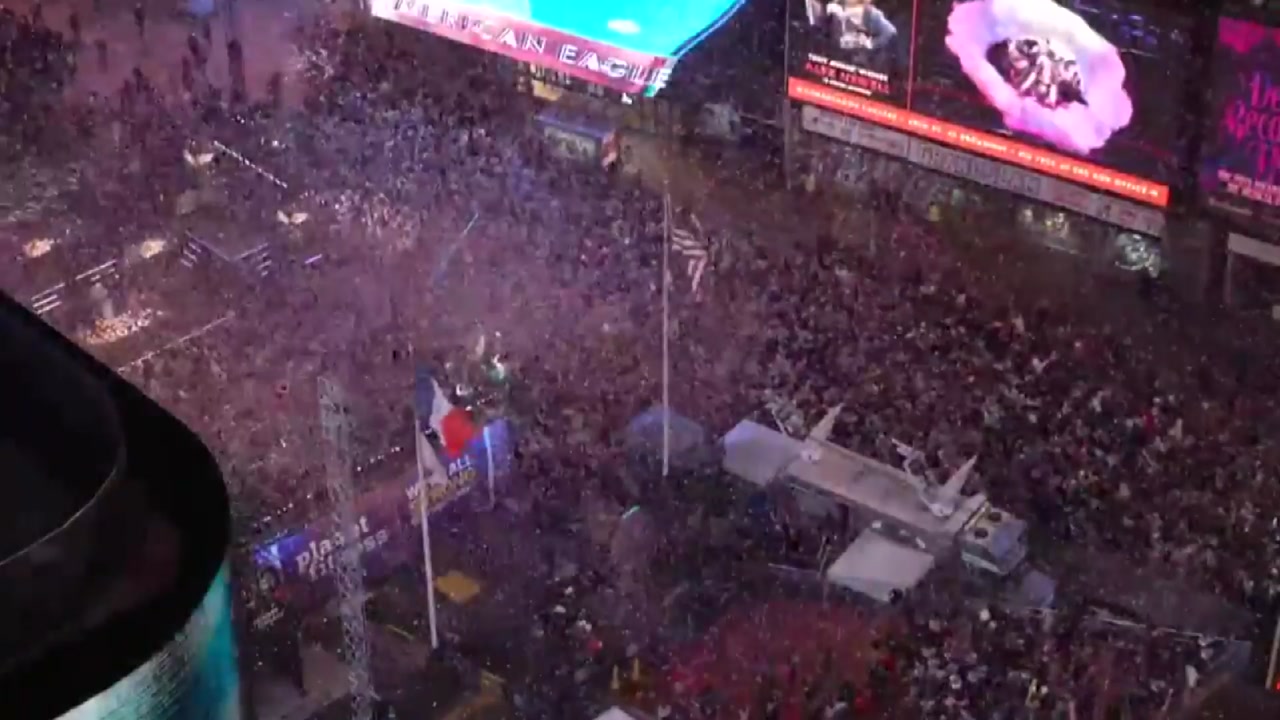 볼이 내려오면서 성조기를 상징하는 빨강, 파랑, 흰색 불이 들어왔고 빨강, 파랑, 흰색의 색종이 조각 1톤 분량이 눈처럼 흩뿌려졌습니다.