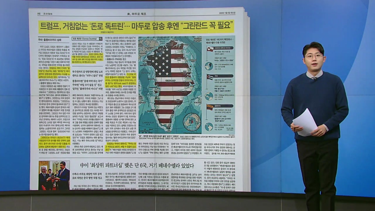 먼저 볼 조선일보 기사는 미국 트럼프 대통령의 거침없는 '돈로 독트린'을 다뤘습니다.