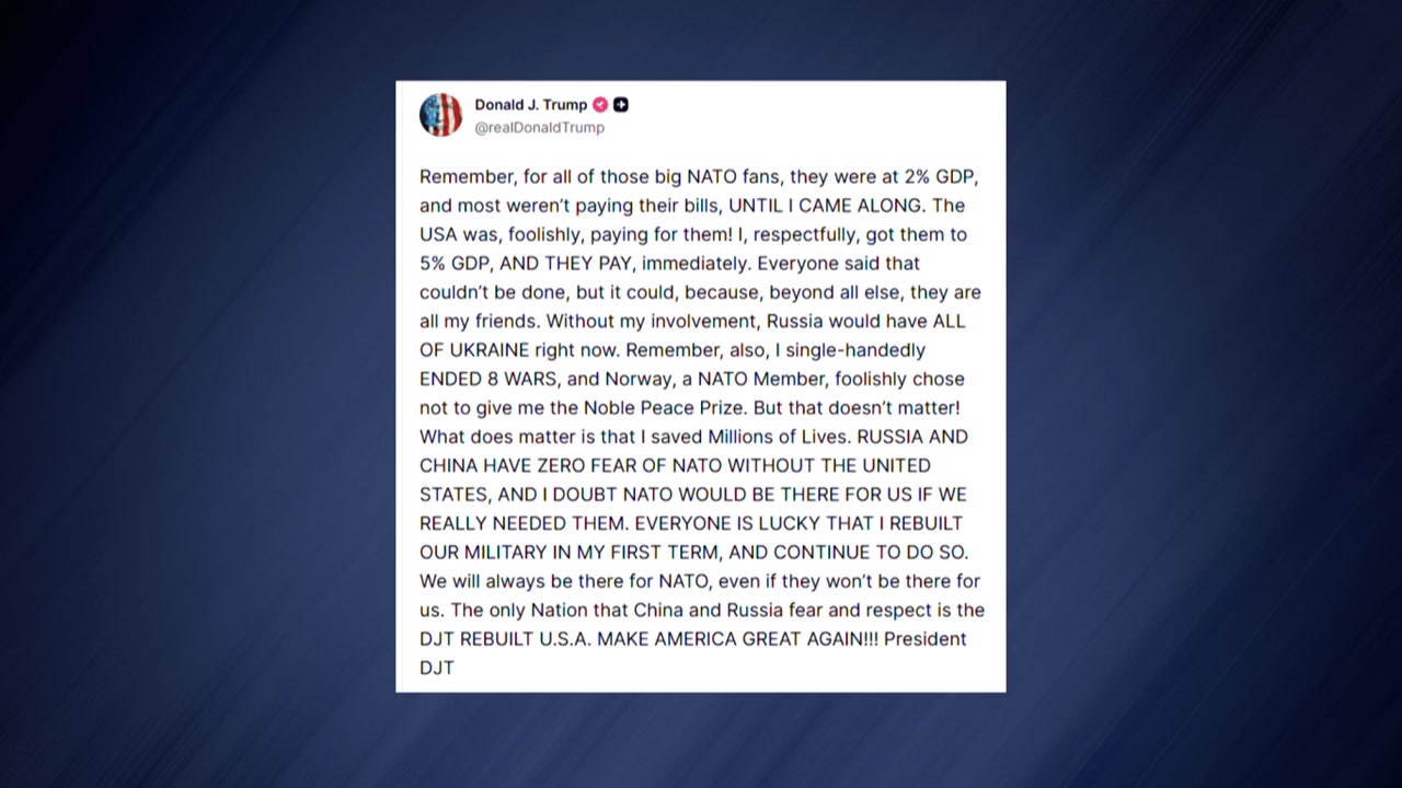 트럼프 대통령은 현지 시간 7일 소셜미디어에 "미국이 없는 나토를 러시아와 중국은 전혀 두려워하지 않는다"며 이같이 적었습니다.