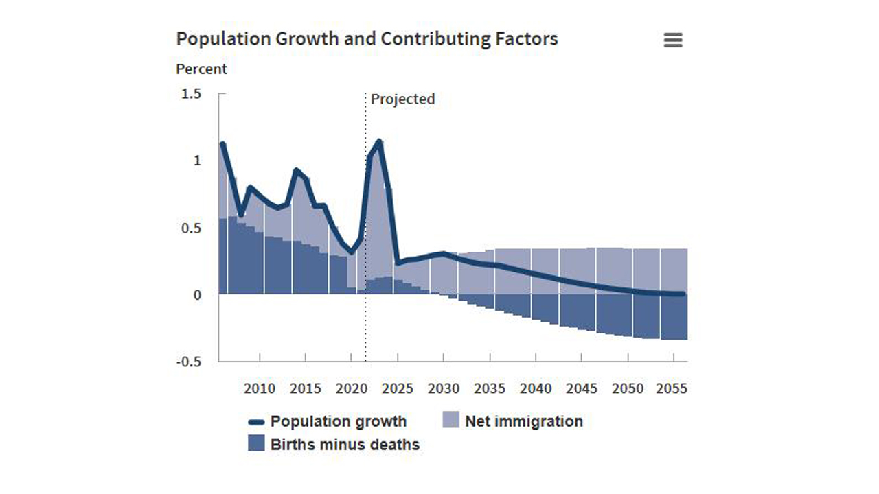 CBO는 이 같은 증가세 둔화의 원인으로 현 정부 이민정책과 합계출산율(여성 1명이 평생 낳을 것으로 추산되는 아이의 수) 하락을 들었습니다.