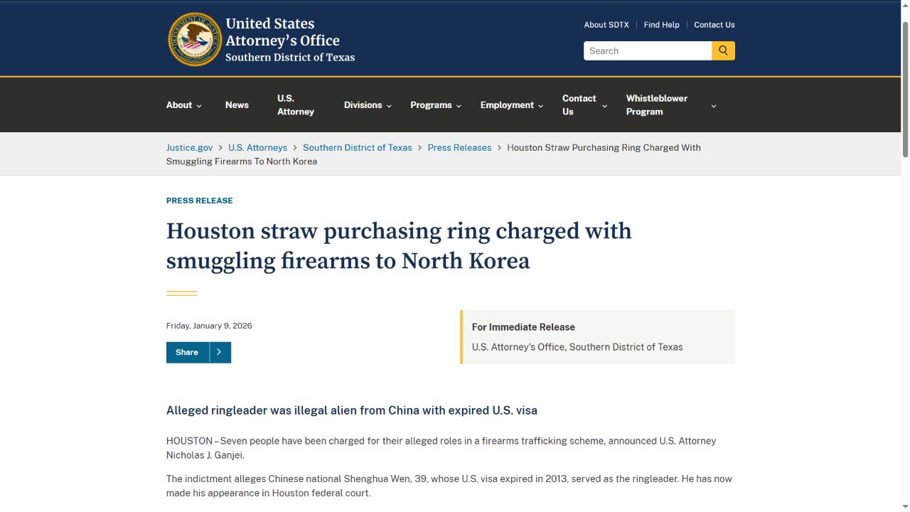 웬은 지난 2023년 로스앤젤레스(LA) 카운티의 롱비치 항구에서 일반 화물처럼 위장한 최소 3개의 컨테이너에 총기를 선적, 중국을 거쳐 북한으로 보냈다는 이유 등으로 2024년 12월 체포됐습니다.