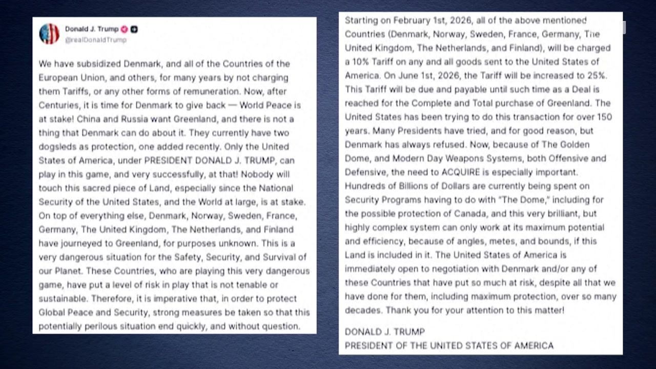 도널드 트럼프 미국 대통령이 미국의 그린란드 병합에 반대하는 유럽국가들을 상대로 다음 달 1일부터 10%, 오는 6월부터 25%의 대미 관세를 부과하겠다고 밝혔습니다.