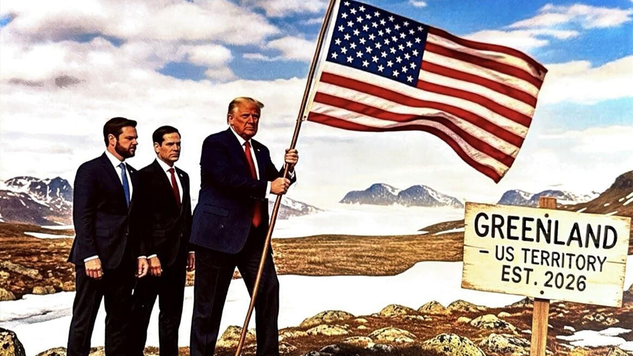 트럼프 대통령 옆에는 마코 루비오 국무부 장관과 JD 밴스 부통령이 서 있고, 사진 속 표지판에는 ’그린란드 - 미국령 EST. 2026’ 이라고 적혀있습니다.