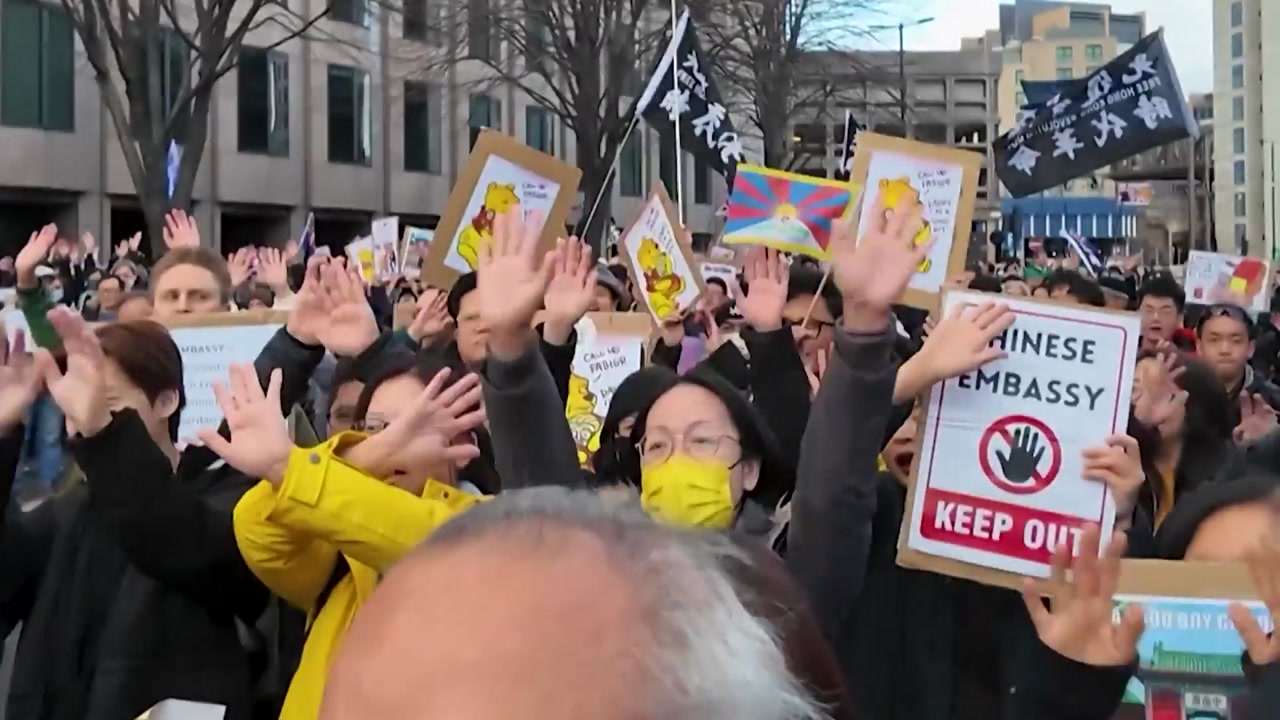 "중국 공산당이 당신을 감시하고 있다"는 팻말을 들고 거리로 나섰습니다.