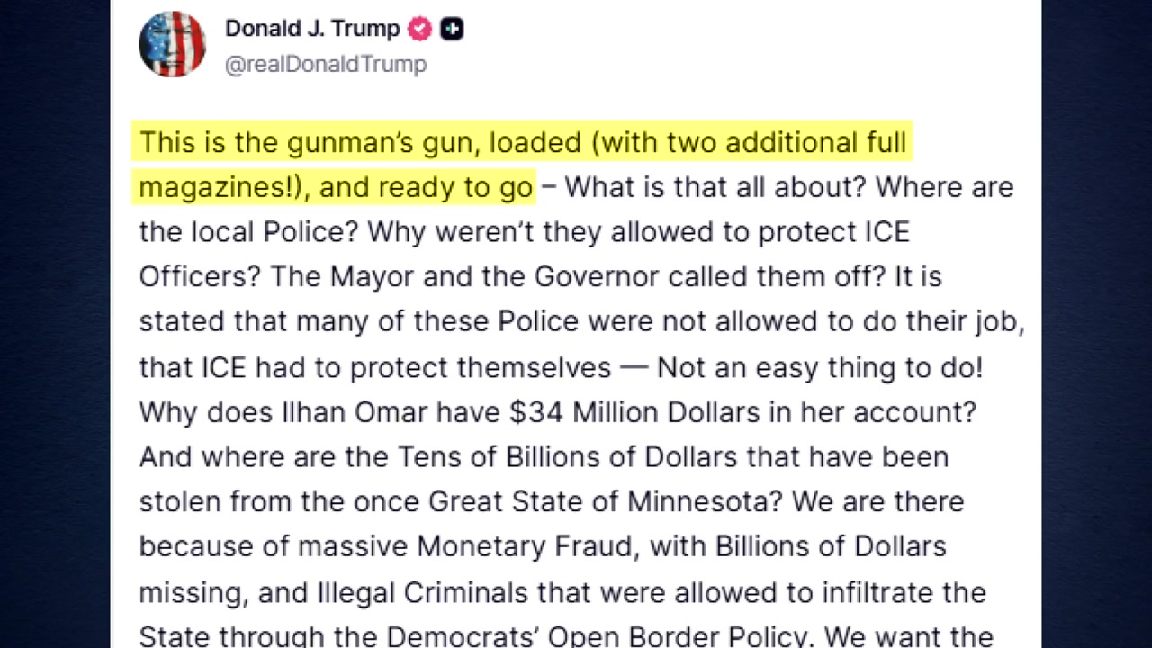 트럼프 대통령은 현지 시간 24일 소셜미디어 트루스소셜에 숨진 남성의 총기와 탄창을 찍은 사진을 올리고 "이것은 총기 소지자의 총"이라며 "장전됐고 발사 준비가 됐다"고 적었습니다.